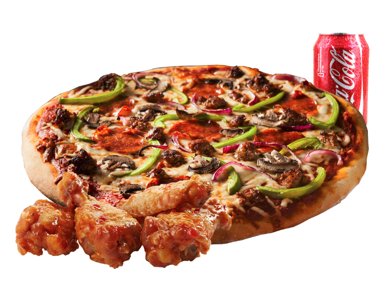 Large Deluxe Pizza, 10 Wings, 4 Cans of Pop Pizza and wings only: 39